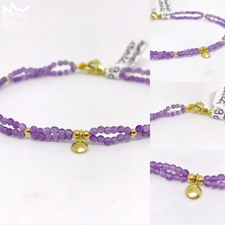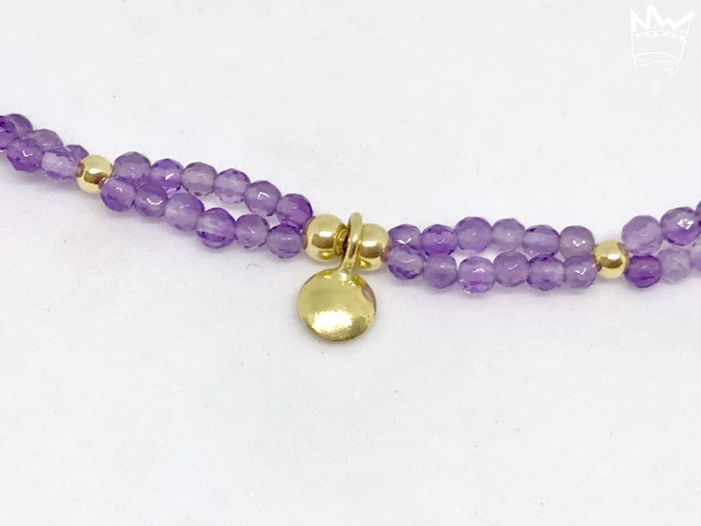 Ein feines, zartes und sehr edles Amethystarmband. Kleine, facettierte Amethystperlen reihen sich zweireihig aneinander und werden von 18kt Goldkugeln ergänzt.