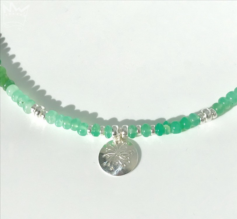 Der Chrysopras und sein frisches, stahlendes Grün machen wirklich gute Laune!! Der wechselnde, helle bis dunkle Farbverlauf unterstreicht die Farblebendigkeit zusätzlich. Die eingearbeiteten Silberringe bilden wundervolle Lichtpunkte. Frontal befindet sich eine Anhängerschale mit einem stilisierten, eingravierten Löwwnzahnsamen. Der Verschluss besteht aus einer 6mm großen Magnetschließe.