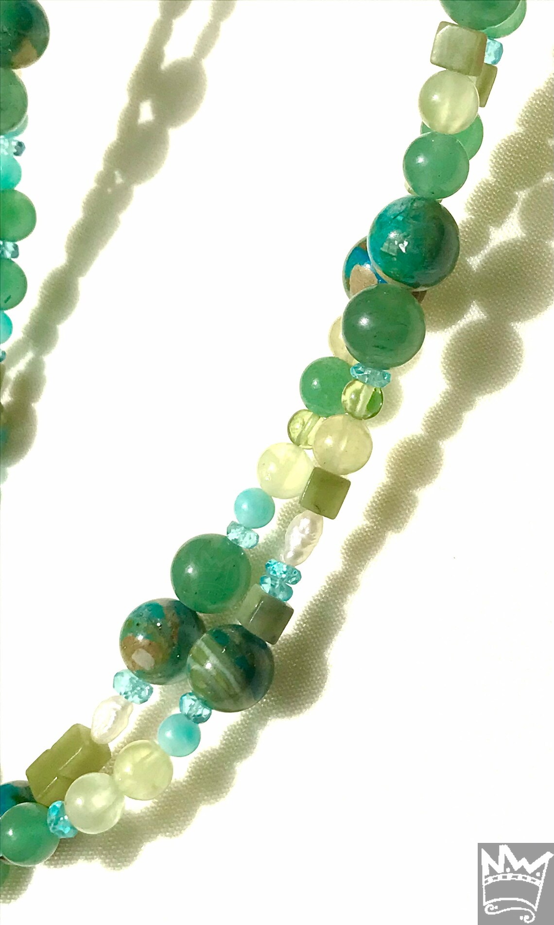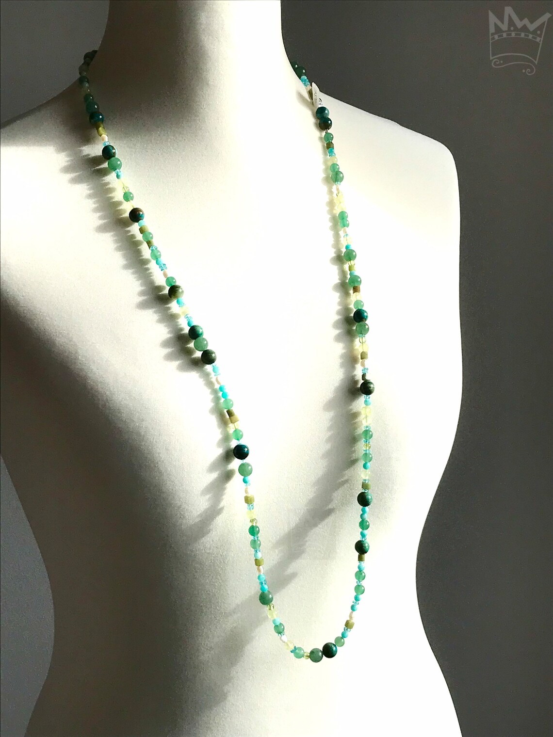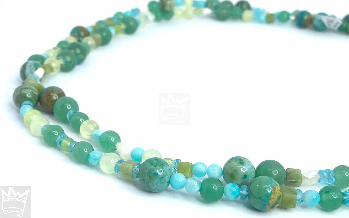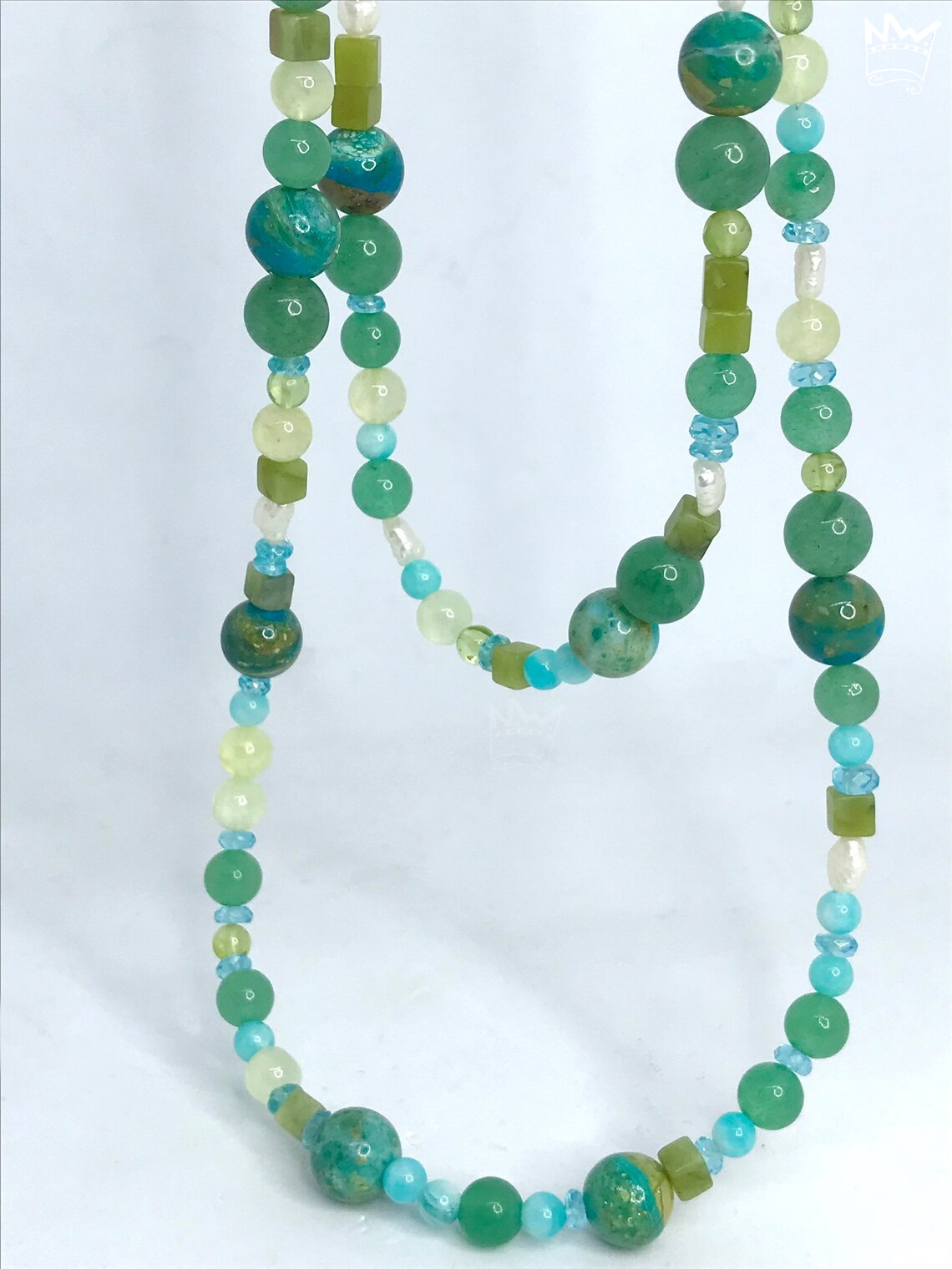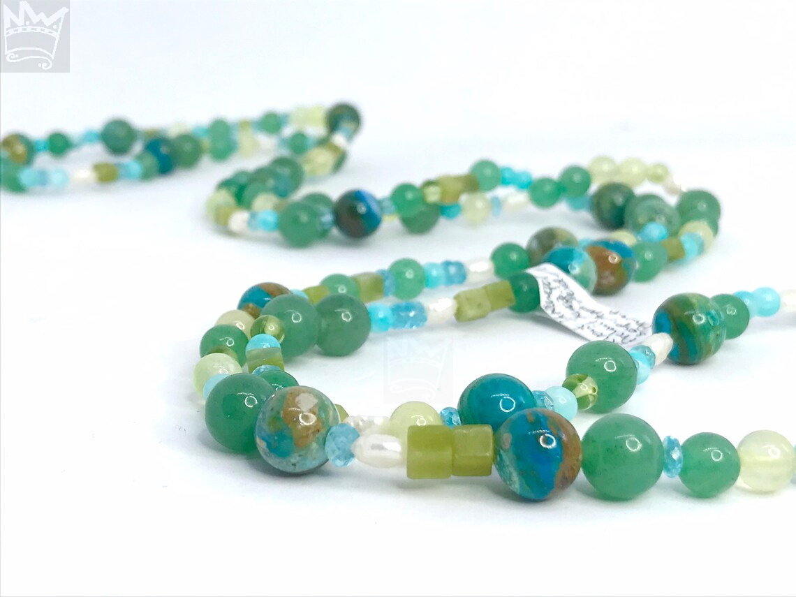 Eine lange, wundervolle Endloskette in Grün - und Türkistönen aus 7 verschiedenen Edelsteinen und Perle. Ein absolutes Must-have-Stück für jeden, der diese Farbkomination liebt.