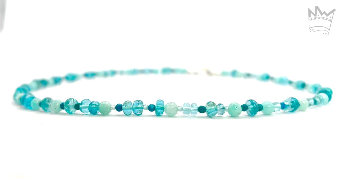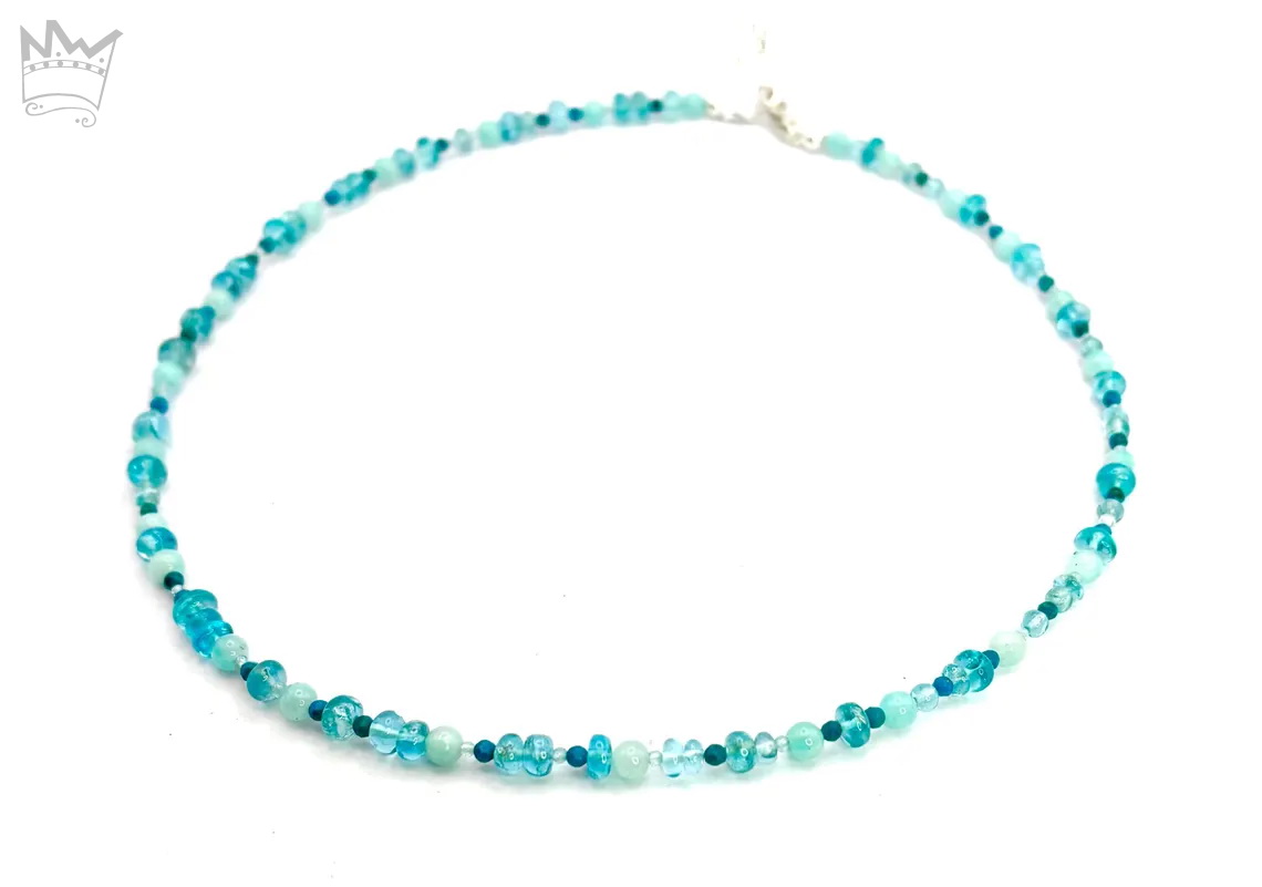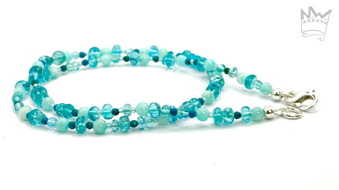 Eine zarte Edelsteinkette aus Amazonit, Apatit und Chrysocoll. Die wunderschönen türkisfarbenen Edelsteine, in unterschiedlichen Schliffformen kombiniert, ergänzen sich zu einer wundervoll, frischen Farbkomposition.