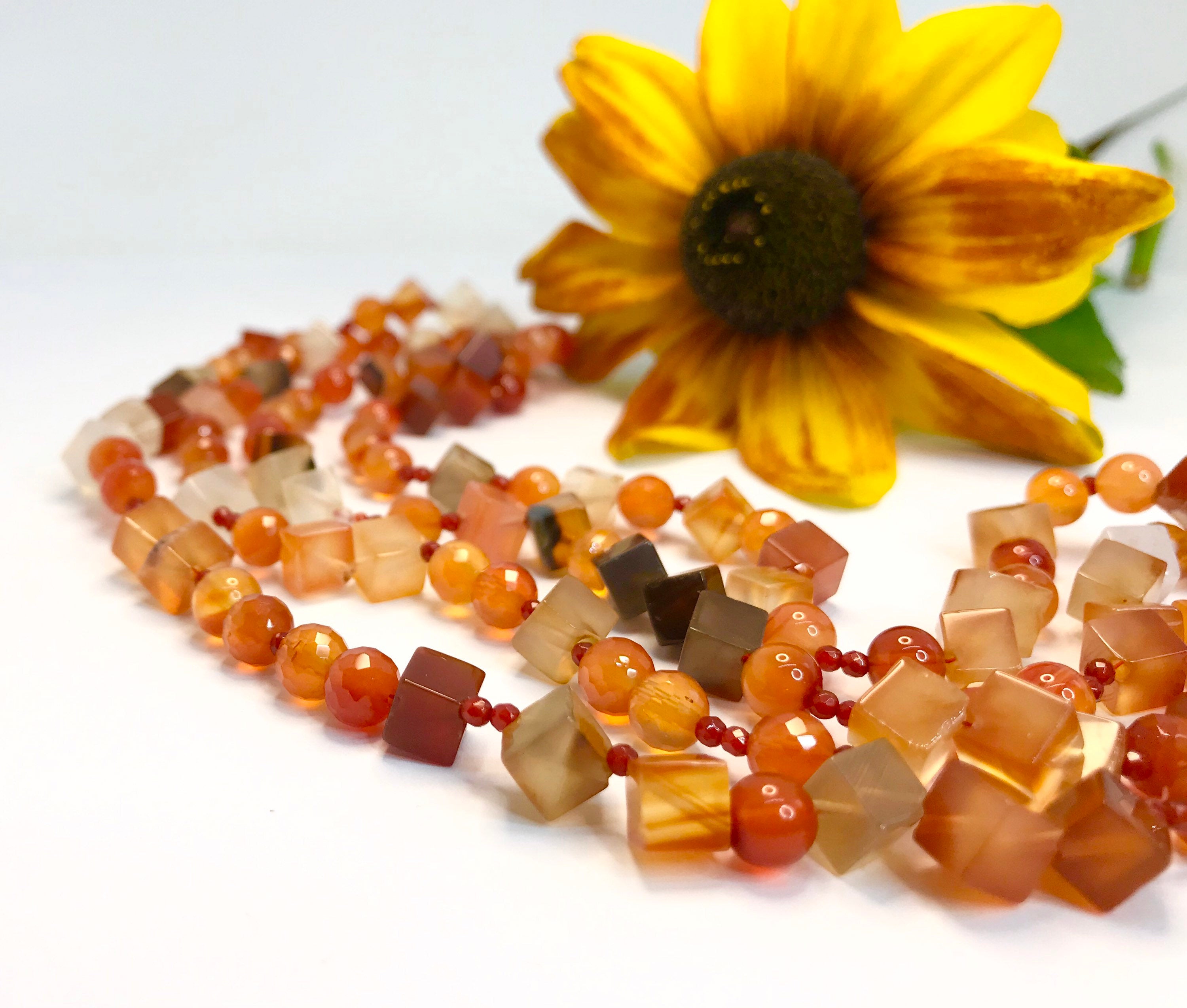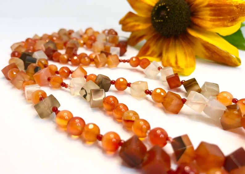 Eine Karneol Kette aus unterschiedlich großen Karneolperlen in Form von Würfeln und glatten und facettierten Kugeln.