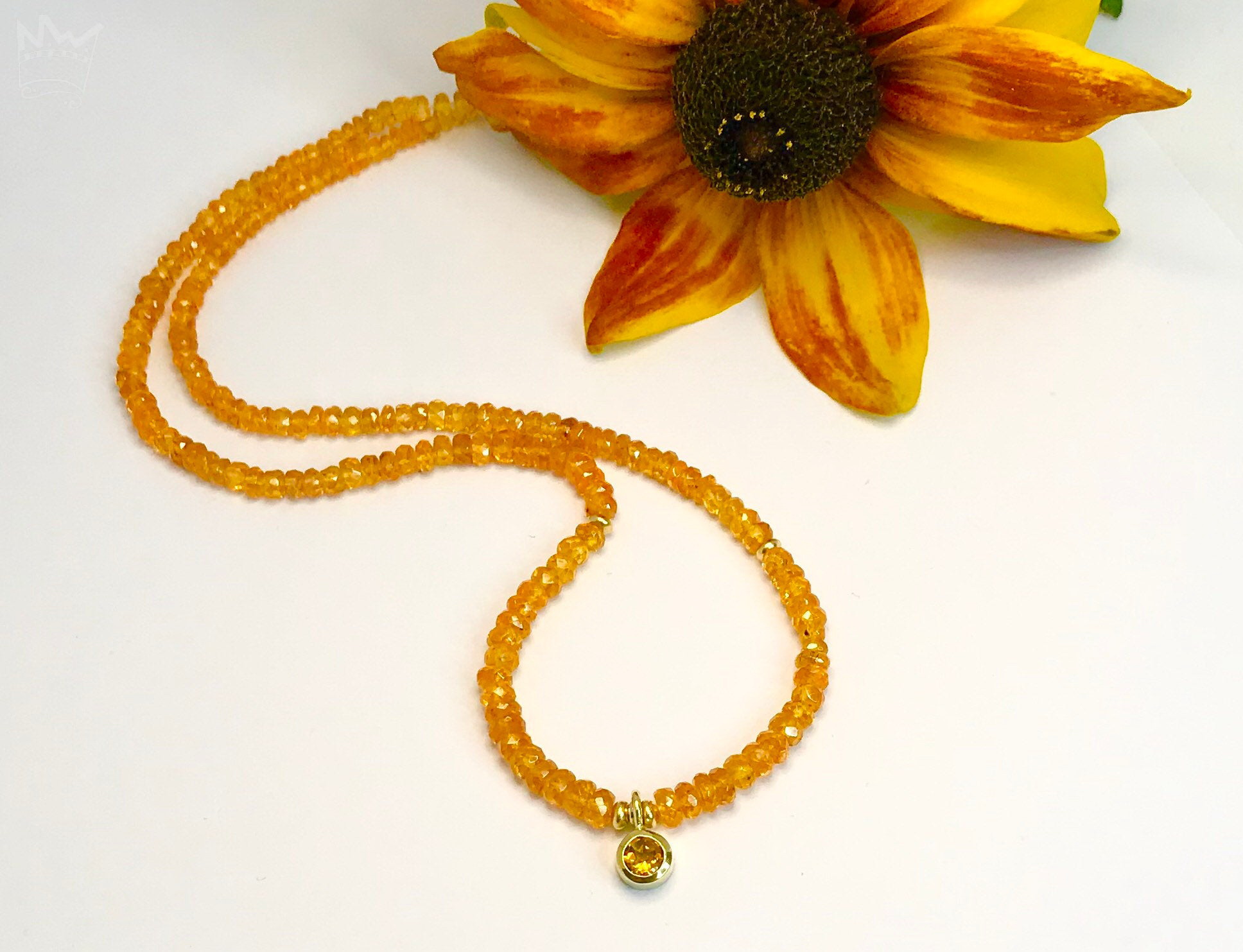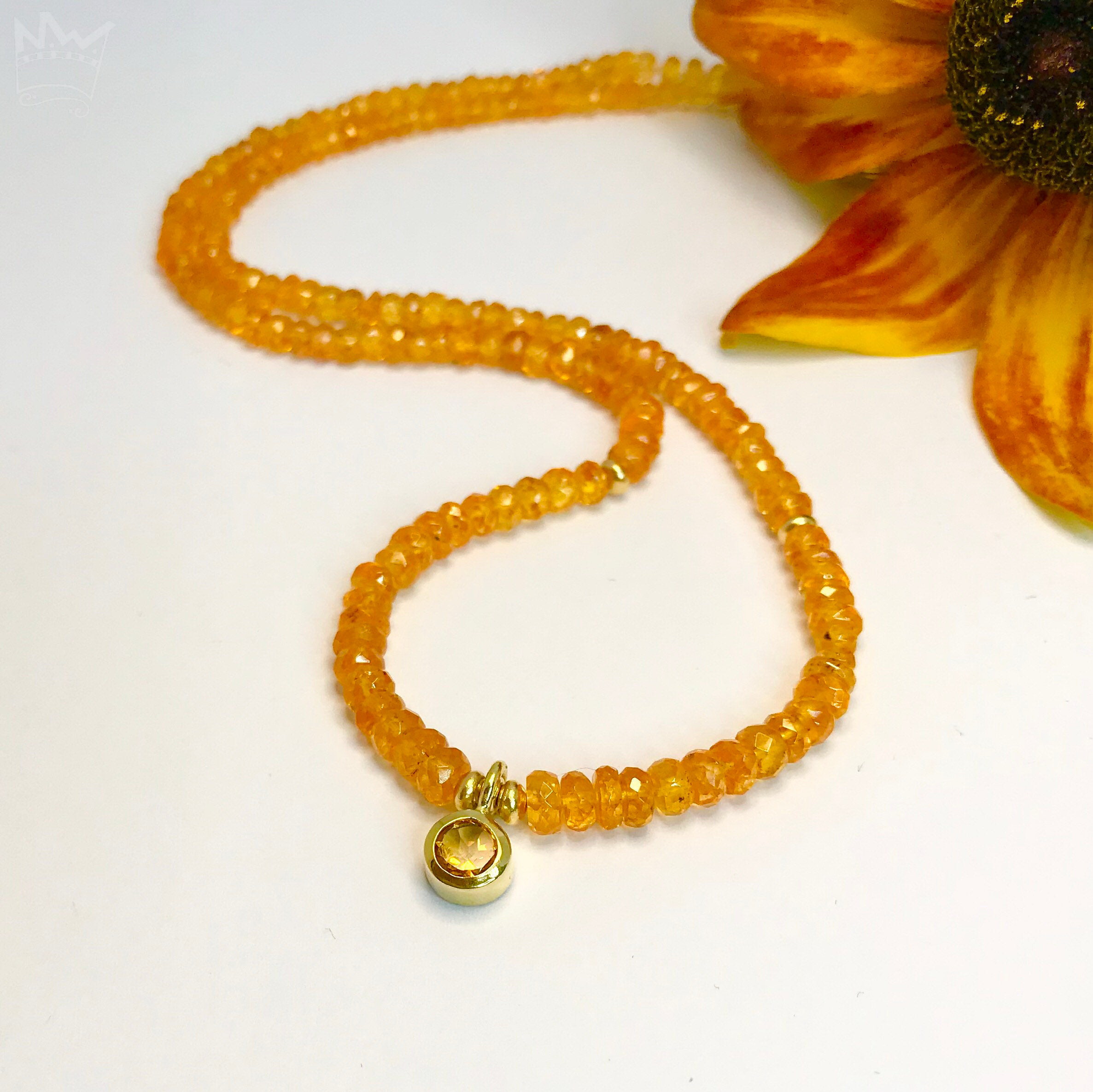 Feine, facettierte Mandaringranatperlen funkeln, schmeichelnd und leicht um den Hals. Ein in 18kt Gelbgold gefasster, runder und facettierter Citrin sorgt für den besonderen Blickfang und Glanzpunkt.