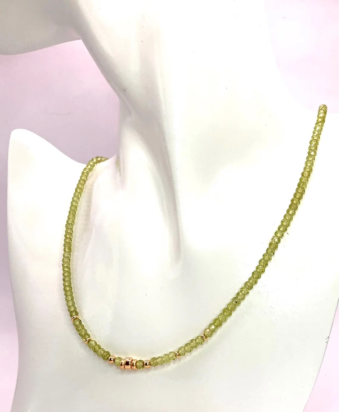 Eine puristische Halskette aus facettierten Peridotbuttonperlen und polierten und mattierten, verschiedenfarbigen Goldelementen aus 18kt Gelbgold.
