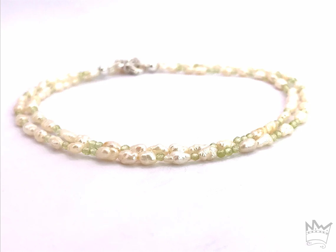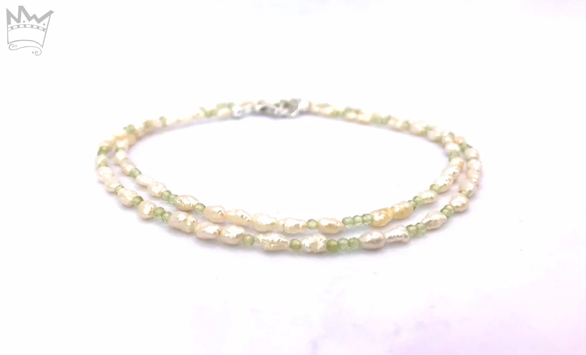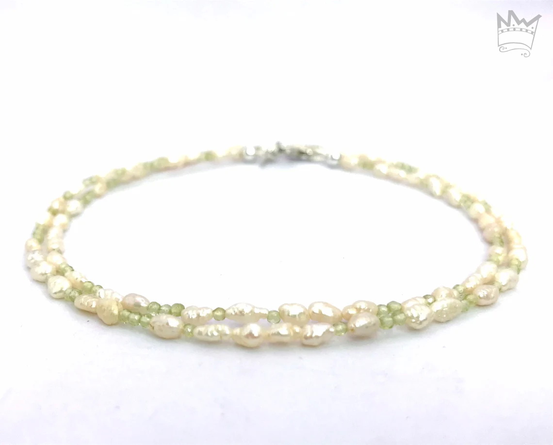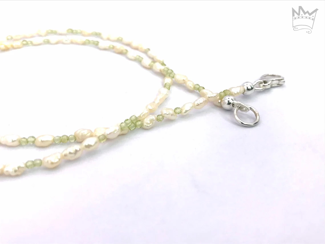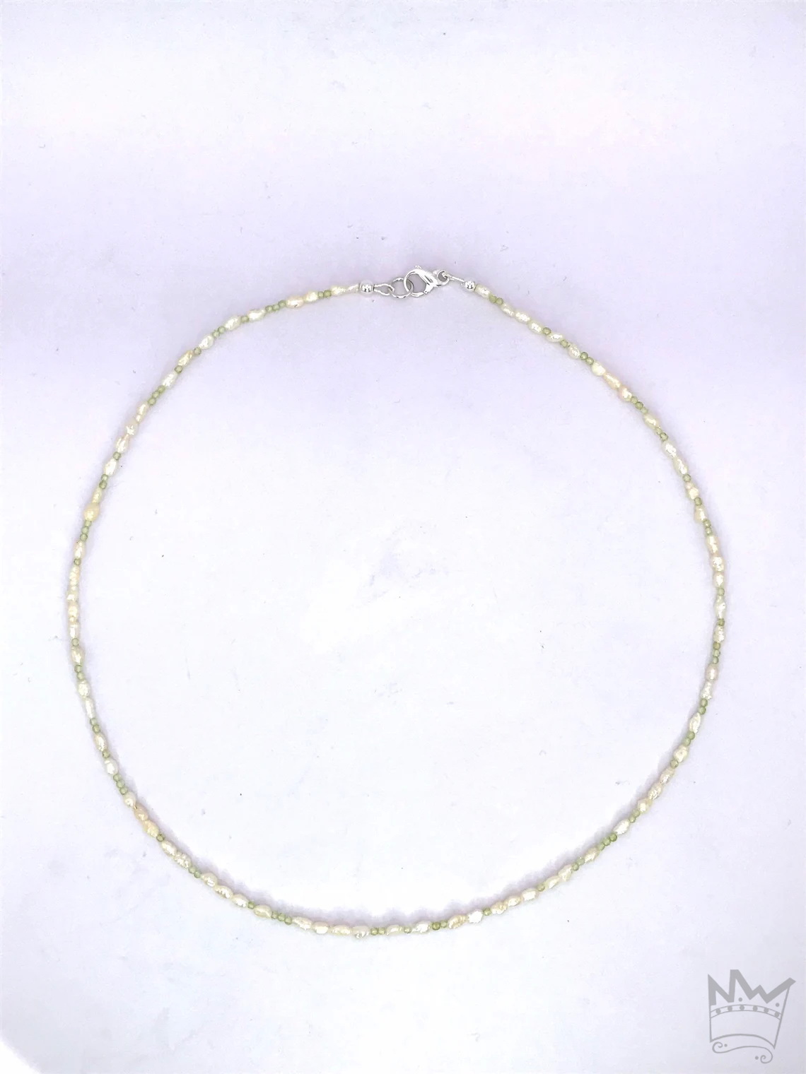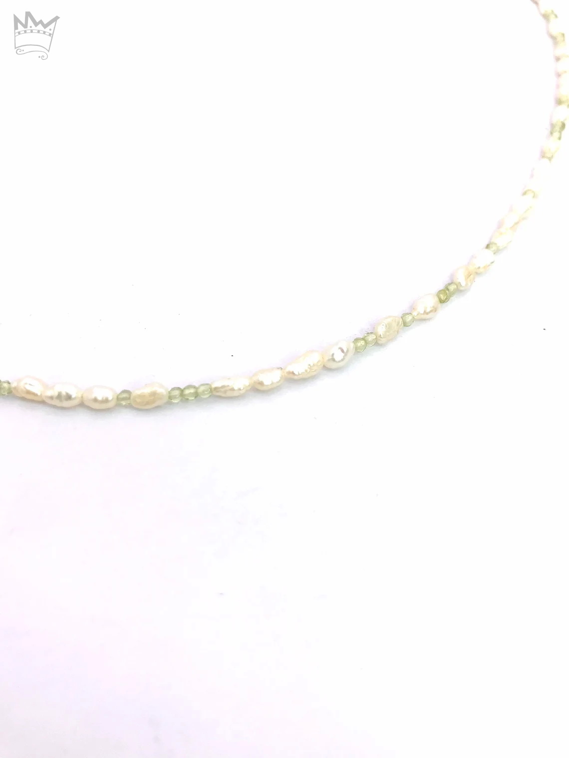 Eine feine Perlenkette in zarten Pastelltönen aus Biwaperle und facettierten Peridotkugeln.