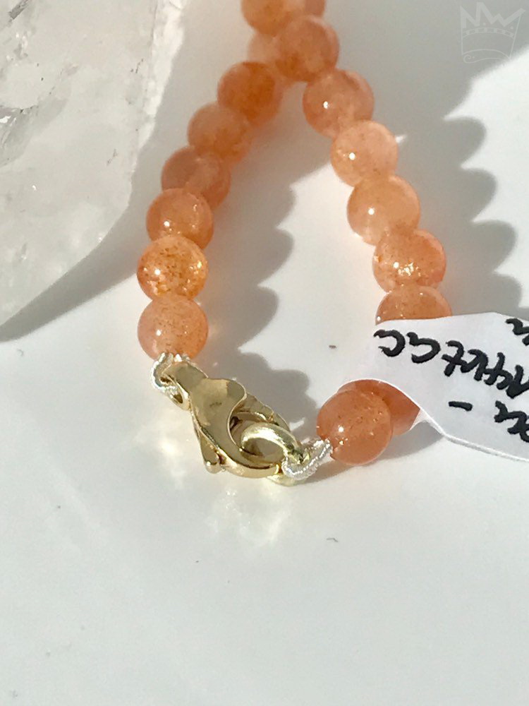 Den ganz bezaubernden Aspekt des orangeroten bis kupferfarben Sonnensteins, bilden die ihm innewohnenden kleinen Kupferblättchen; sie verleihen dem Stein sein feines, typisches Glitzern. Mittig befindet sich eine kleine Goldschale aus 14kt, massivem Gelbgold und im Verlauf der Kette werden die runden Perlen von insgesamt 10 zarten Goldringlein aufgelockert.