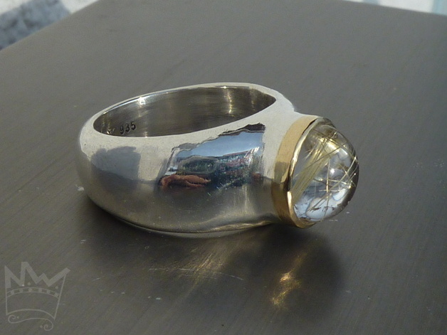 Der runde Rutilquarz ist in eine Fassung aus 750er Gold gefasst, die auf einem silbernen Sockel sitzt, der nahtlos in die Ringschiene übergeht.Die Breite der Ringschiene verjüngt sich zur Handinnenseite.Die goldenen Titandioxidnadeln finden in der Fassung ein wunderschöne farbliche Entsprechung und unterstreichen sich gegenseitig in der Farbgebung.