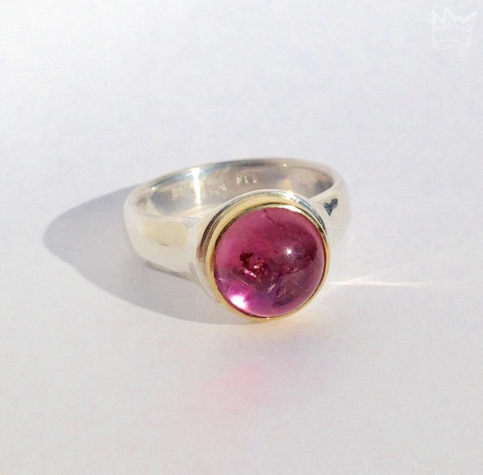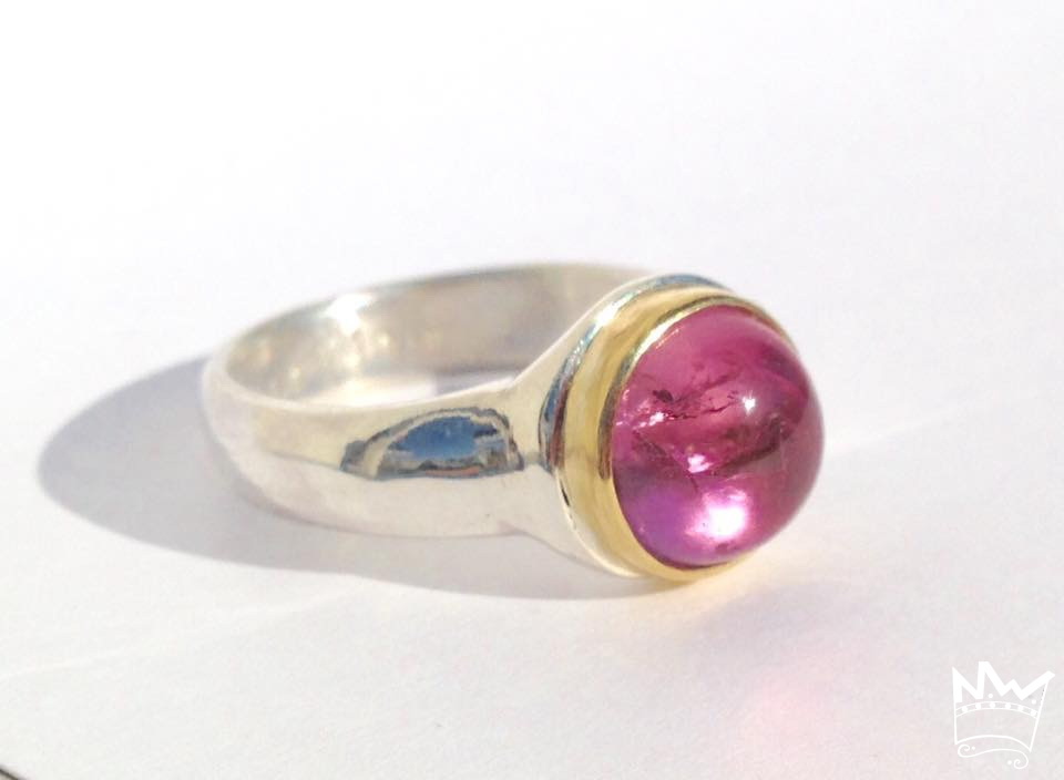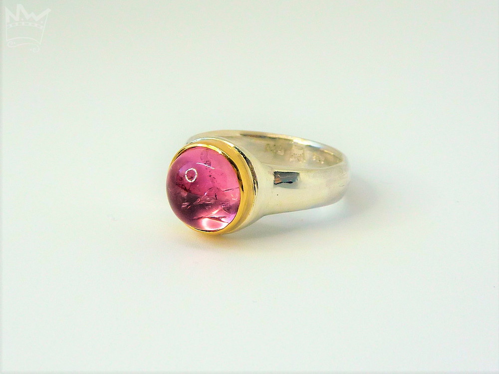 Ein wundervoller, runder,rosaner Turmalin mit lebendigen Wachstumsspuren, in 750er Gelbgold gefasst, sitzt auf einer Ringschiene in 935er Silber.